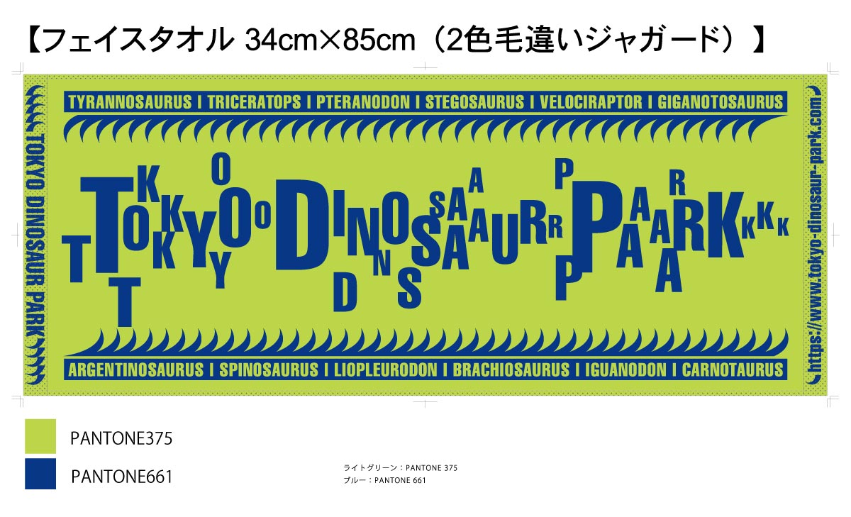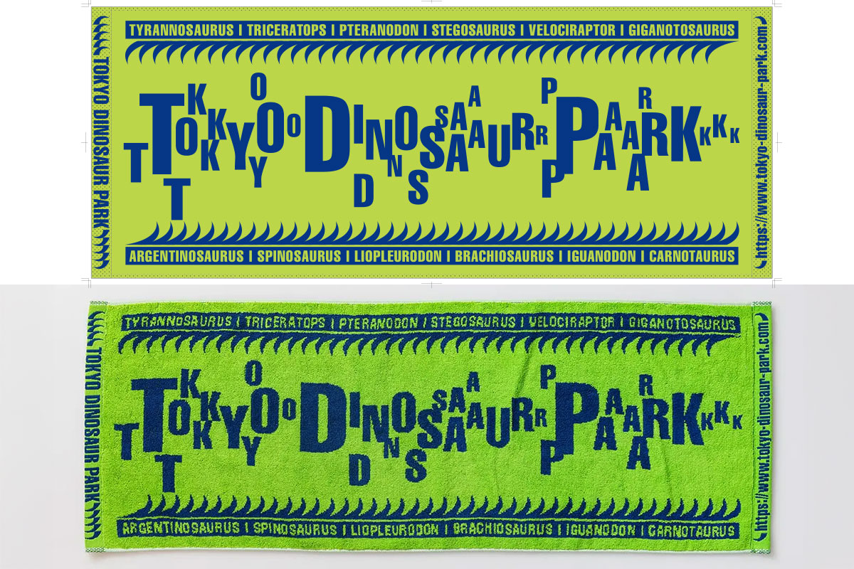 今回の「恐竜パーク」のデザインであれば、表面で「黄緑色の背景に紺色の文字」となっている部分は、裏面では「紺色の背景に黄緑色の文字」として表現されます。 裏側が白になってしまうプリントタオルとは異なり、裏面を見せてもデザインとして成立するため、首にかけた時や畳んだ時にも見栄えが良いです。
