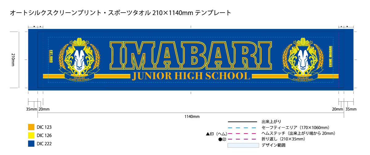 入稿フォーマットに沿ってデザインを配置し、画面左下に特色指定を記載してあります。タオルの端から端まで全面をくまなく青色で染めるデザインのため、出来上がり位置より外側まで塗り足しがあります。