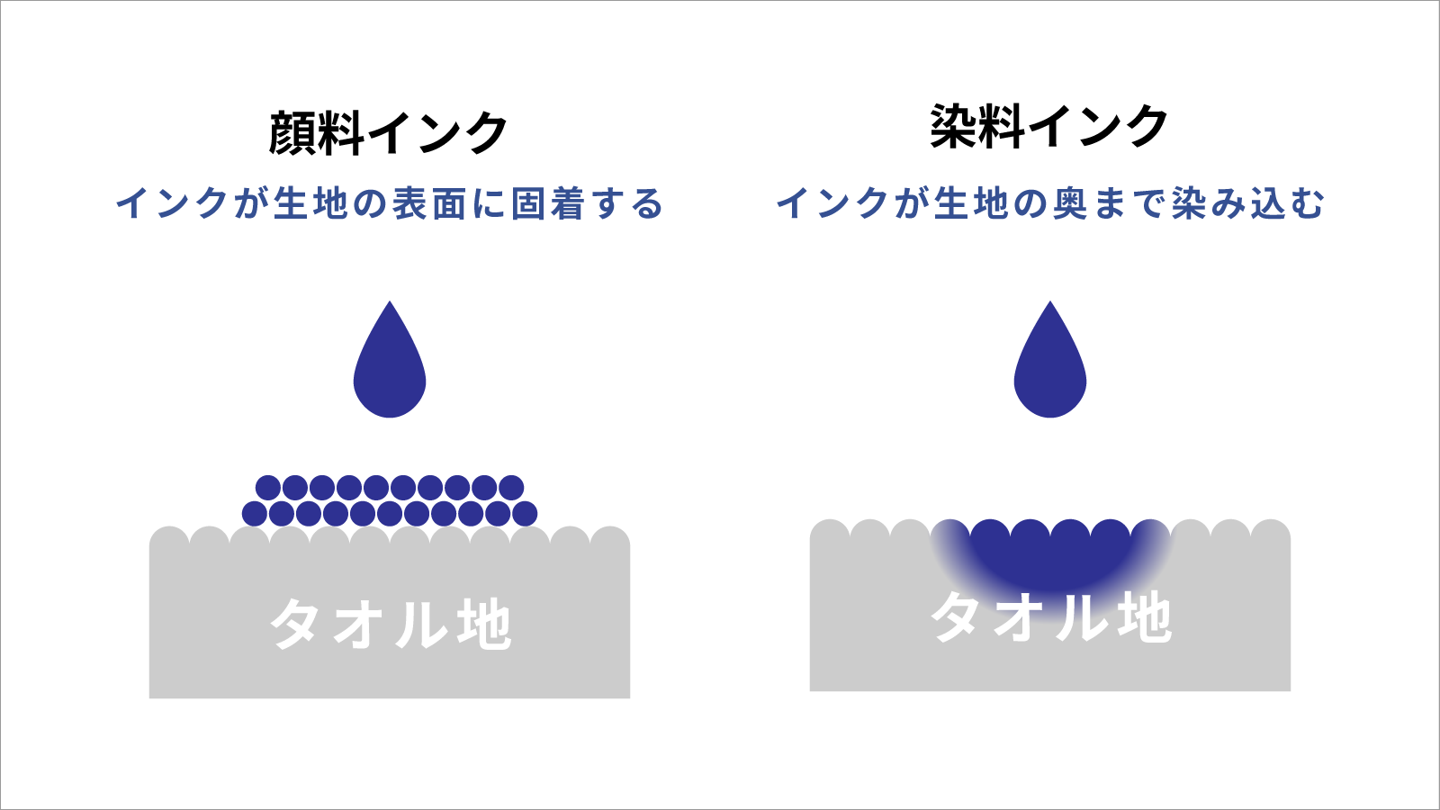 ご安心ください。今回の事例で採用している「染料プリント」は、インクを生地の“上”に乗せる「顔料プリント」とは異なり、糸(繊維)そのものを染め上げる方法です。そのため、プリント後も糸が硬くなることなく、タオル本来の柔らかい肌触りと優れた吸水性が損なわれません。