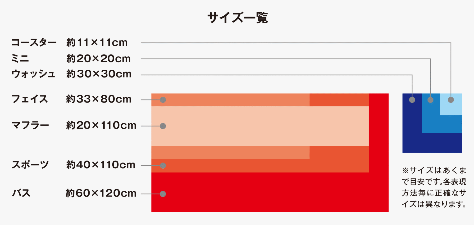 マフラータオルは、スポーツタオルと同じ長さで幅が半分のサイズで、日常でよく使うフェイスタオルよりも細長いサイズ感のタオルです。