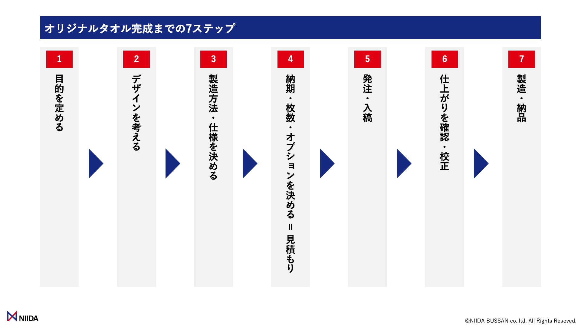 オリジナルタオルの製作ステップはこれだけです。いかがですか?こうして見ると、ゴールまでの道のりがイメージできたのではないでしょうか。 この連載では、このステップを一つひとつ、丁寧に解説していきますのでご安心くださいね。