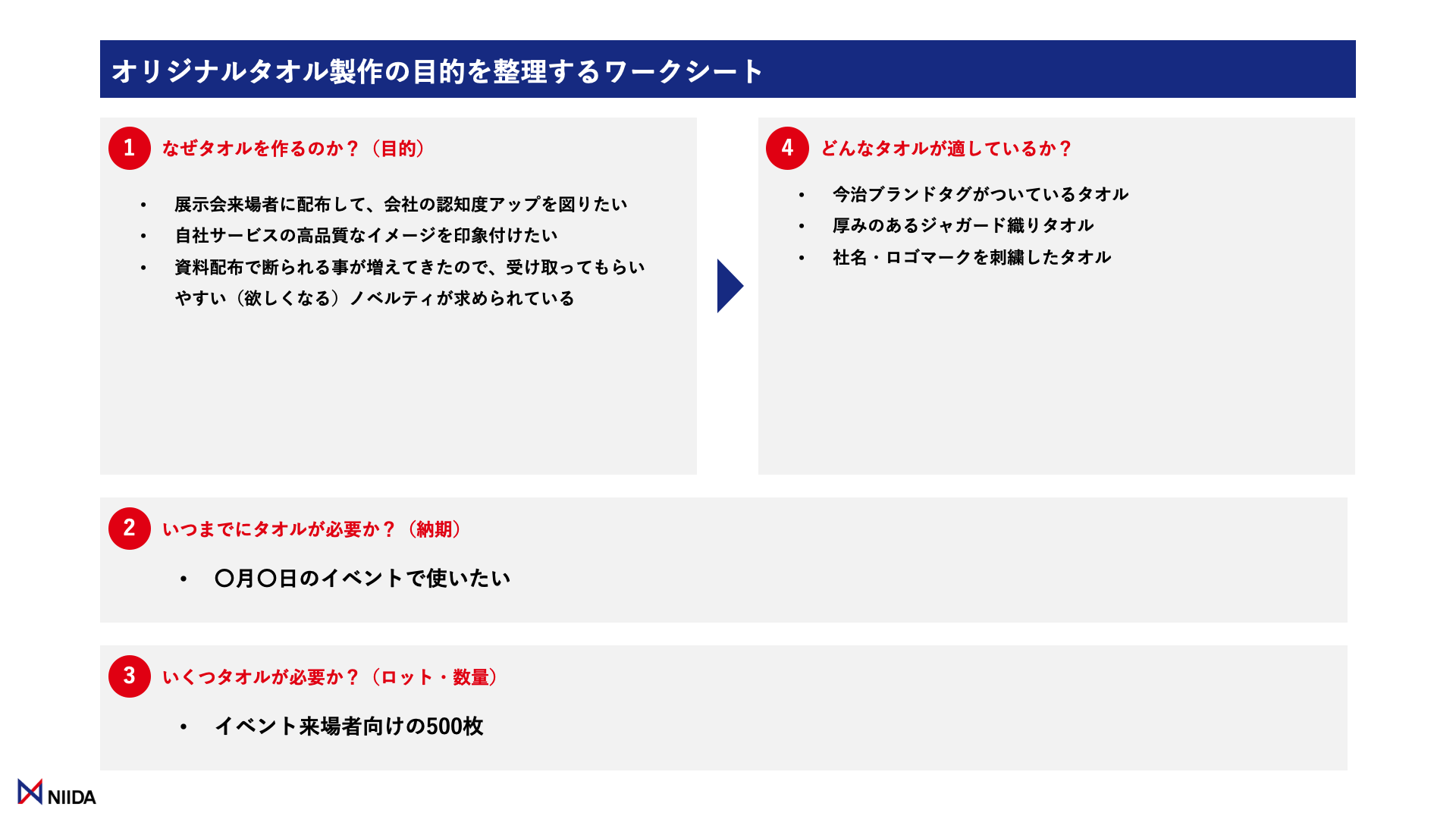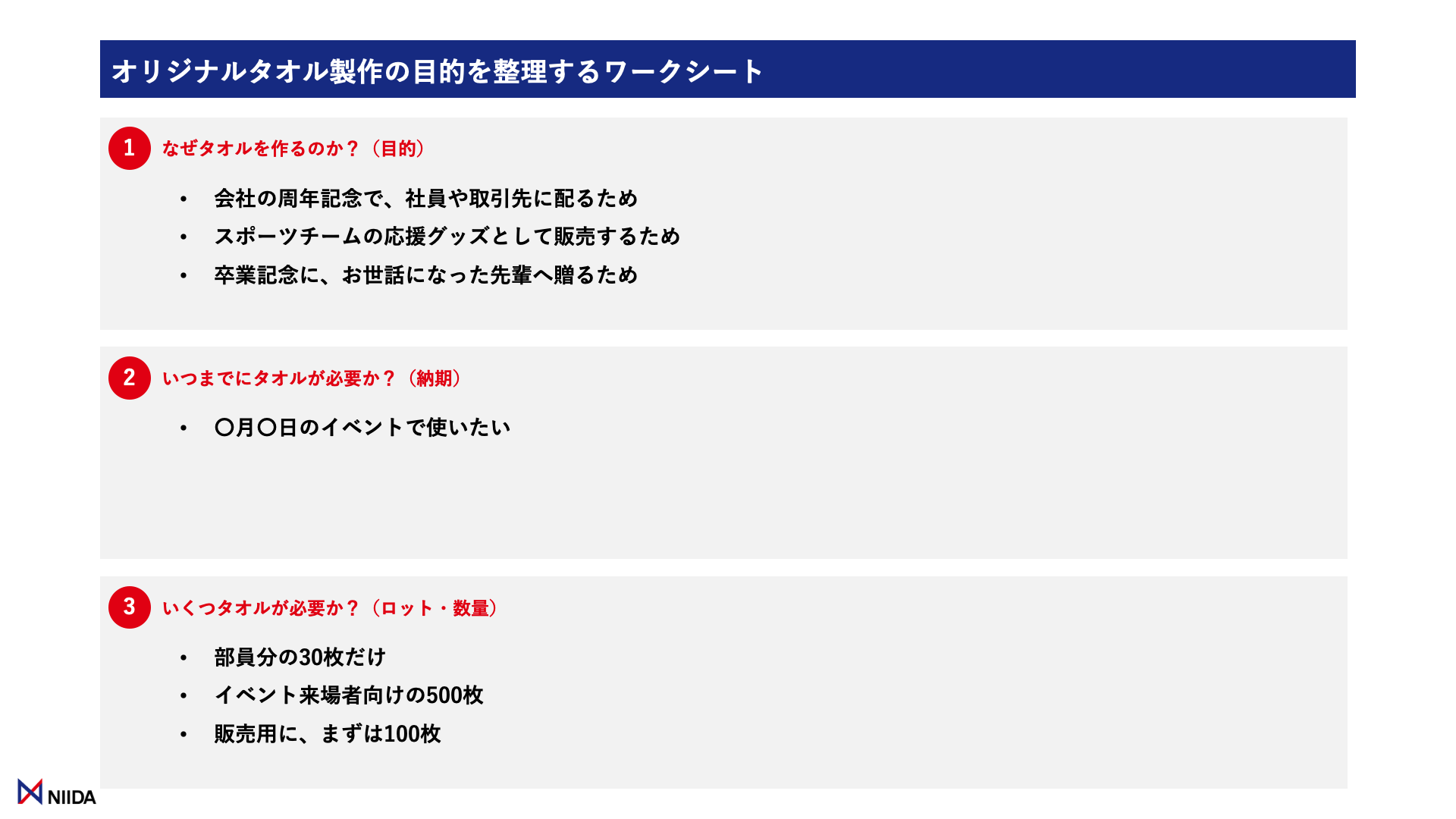 オリジナルタオル製作最初のステップは、タオルを作る「目的」を明確にすること。