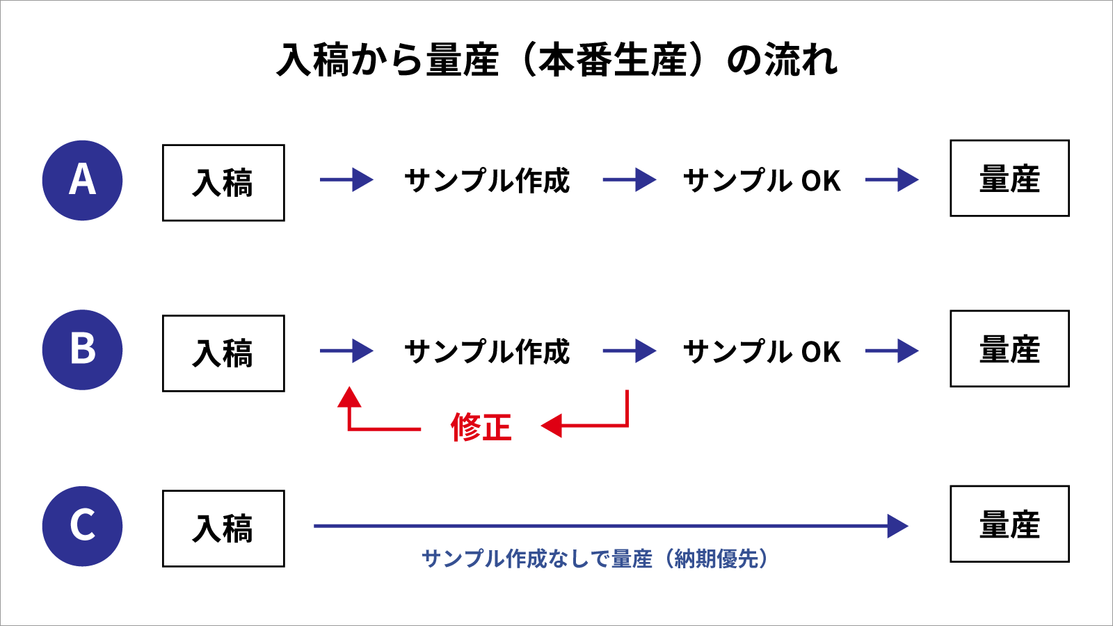 発注後は、入稿から量産までは大まかには上図の3パターンです。